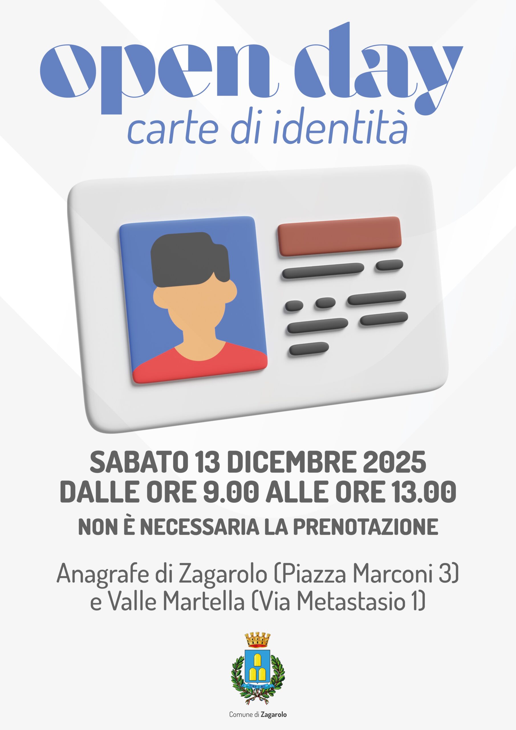 Sabato 13 Dicembre 2025, dalle ore 9.00 alle 13.00, il Comune di Zagarolo organizza un open day dedicato alle carte di identità.